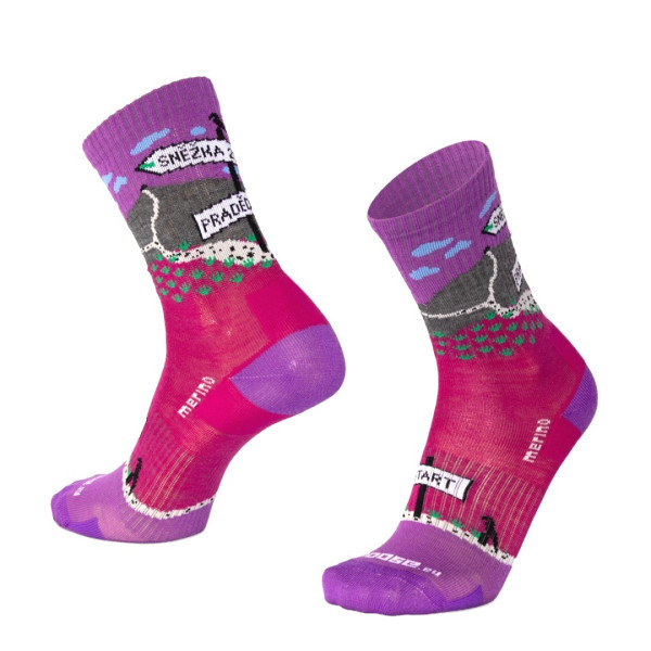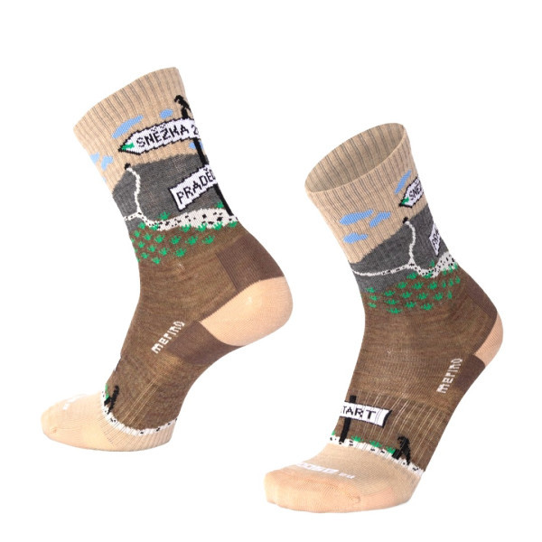 Hravý turistický dizajn ponožiek z radu BESKYD Merino ti ukáže, ako ďaleko je to od nás z Třebíča na Sněžku a Praděd a je pripravený na celoročné využitie na širokú paletu outdoorových aktivít, ale napríklad aj ako pohodlné ponožky do práce alebo pre zábavu. Ponožky sú v hladkom prevedení s jemnou vetracou sieťkou na priehlavku. Vyrobené sú v klasickej výške, dobre teda padnú aj do vyšších topánok. Zachovávajú si športový strih, Achilovka, päta, špice aj časť chodidla sú opatrené dodatočným zosilňovaním. Klenba chodidla je navyše podporená elastickým pásikom proti kĺzaniu ponožky. Špička je ako vždy zakončená kvalitným, jemným, netlačiacim švom. Nosným prvkom tohto radu je kvalitná Merino vlna v kombinácii s rôznymi typmi elastanov a talianskymi polyamidmi.